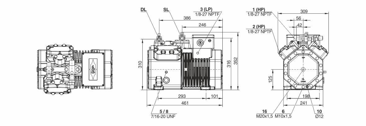 Технические данные: Рабочий объём (1450 об/мин, 50 Гц): 32,48 м3/ч; Рабочий объём (1750 об/мин, 60 Гц): 39,20 м3/ч; Количество цилиндров x диаметр x ход поршня: 4 x 55 мм x 39,3 мм; Вес: 99 кг; Макс. давление (LP/HP): 19 / 32 бар; Тип масла: R134a/R407C/R404A/R507A/R407A/R407F: BSE32 (стандартный) | R134a при температуре выше 70 °C: BSE55 (опция); Масло типа R22 (R12/R502): B5.2 (опция); Масло типа R1234yf: BSE32 (стандартный) | R1234yf tc>70°C : BSE55 (опция); Масло типа R1234ze: BSE55 (стандартный) | при температуре выше 15 °C: BSE85K (опция) | при температуре выше 70 °C: BSE85K (опция); Масло типа R454C/R455A: BSE32 (стандартный). Данные двигателя: Версия двигателя: 1; Напряжение двигателя (подробнее по запросу): 380–420 В, 3–50 Гц; Максимальный рабочий ток: 20.2 А; Максимальная потребляемая мощность: 11,3 кВт; Защита двигателя: SE-B3 (опция), SE-B2 (опция), CM-RC-02 (стандарт); Запорный клапан: Стандартный; Всасывающий запорный клапан: Стандартный; Контроль производительности: 100–50 % (на выбор); Масляный нагреватель: 0–120 Вт PTC (опция); Контроль уровня масла: OLC-K1 (опция); Уровень звуковой мощности (+5 °C / 50 °C): 73,2 дБ(А) при частоте 50 Гц; Уровень звуковой мощности (-10 °C / 45 °C): 74,1 дБ(А) при частоте 50 Гц; Уровень звуковой мощности (-35 °C / 40 °C): 76,5 дБ(А) при частоте 50 Гц; Уровень звукового давления на расстоянии 1 м (+5 °C / 50 °C): 65,2 дБ(А) при частоте 50 Гц; Уровень звукового давления на расстоянии 1 м (-10 °C / 45 °C): 66,11 дБ(А) при частоте 50 Гц; Уровень звукового давления на расстоянии 1 м (-35 °C / 40 °C): 68,5 дБ(А) при частоте 50 Гц.