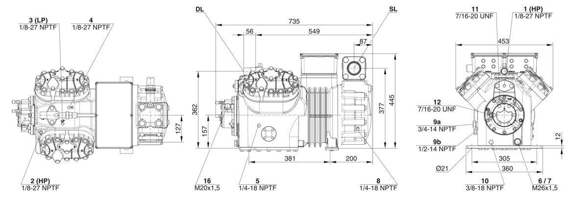 Технические данные: Рабочий объём (1450 об/мин, 50 Гц): 101,8 м³/ч; Рабочий объём (1750 об/мин, 60 Гц): 121,3 м³/ч; Количество цилиндров x диаметр x ход поршня: 4 x 82 мм x 55 мм; Вес: 207 кг.; Тип масла: R134a/R407C/R404A/R507A/R407A/R407F: BSE32 (стандартный) | R134a при температуре выше 70 °C: BSE55 (опция); Масло типа R22 (R12/R502): B5.2 (опция); Масло типа R1234yf: BSE32 (стандартный) | R1234yf при температуре выше 70 °C: BSE55 (опция); Масло типа R1234ze: BSE55 (стандартный) | при температуре выше 15 °C: BSE85K (опция) | при температуре выше 70 °C: BSE85K (опция); Масло типа R454C/R455A: BSE32 (стандартный). Данные двигателя: Версия двигателя: 1; Напряжение двигателя (подробнее по запросу): 380–420 В, ПВ-3, 50 Гц; Максимальный рабочий ток: 62.1 А; Коэф. намотки: 50/50; Пусковой ток (при заблокированном роторе): 141,0 A Y / 233,0 A YY; Максимальная потребляемая мощность: 35,0 кВт; Защита двигателя: SE-B3 (опция), SE-B2 (опция), CM-RC-02 (стандарт); Запорный клапан: Стандартный; Всасывающий запорный клапан: Стандартный; Контроль производительности: 100–50 % (на выбор); Масляный нагреватель: 140 Вт (опция); Контроль давления масла: MP54 (опция); Уровень звуковой мощности (+5 °C / 50 °C): 81,5 дБ(А) при частоте 50 Гц; Уровень звуковой мощности (-10 °C / 45 °C): 81,0 дБ(А) при частоте 50 Гц; Уровень звуковой мощности (-35 °C / 40 °C): 86,5 дБ(А) при 50 Гц; Уровень звукового давления на расстоянии 1 м (+5 °C / 50 °C): 73,5 дБ(А) при 50 Гц; Уровень звукового давления на расстоянии 1 м (-10 °C / 45 °C): 73 дБ(А) при 50 Гц; Уровень звукового давления на расстоянии 1 м (-35 °C / 40 °C): 78,5 дБ(А) при частоте 50 Гц; Уровень звуковой мощности (+5 °C / 50 °C) R134a: 79,5 дБ(А) при частоте 50 Гц; Уровень звуковой мощности (-10 °C / 45 °C) R134a: 79 дБ(А) при 50 Гц; Уровень звукового давления на расстоянии 1 м (+5 °C / 50 °C) R134a: 71,5 дБ(А) при частоте 50 Гц; Уровень звукового давления на расстоянии 1 м (-10 °C / 45 °C) R134a: 71 дБ(А) при 50 Гц.