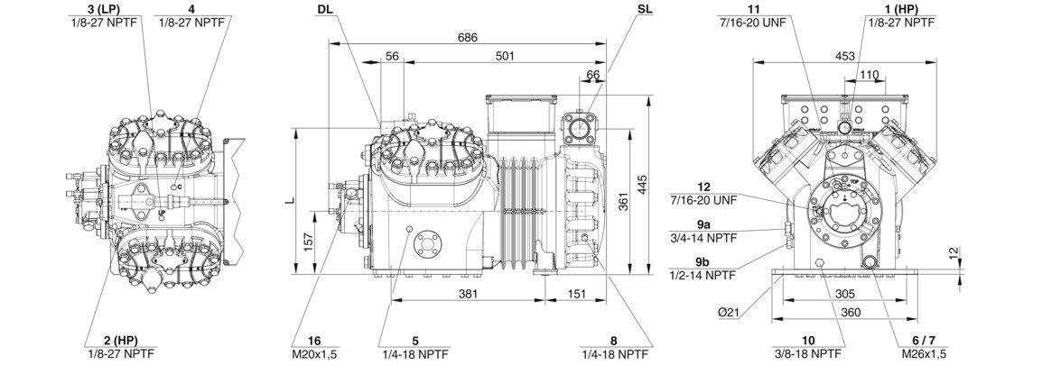 Технические данные: Рабочий объём (1450 об/мин, 50 Гц): 63,5 м³/ч; Рабочий объём (1750 об/мин, 60 Гц): 76,64 м³/ч; Частотный диапазон: 25–70 Гц; Количество цилиндров x диаметр x ход поршня: 4 x 65 мм x 55 мм; Вес: 188 кг.; Макс. давление (LP/HP): 19 / 32 бар; Тип масла: R134a/R407C/R404A/R507A/R407A/R407F: BSE32 (стандартный) | R134a при температуре выше 70 °C: BSE55 (опция); Масло типа R1234yf: BSE32 (стандартный) | R1234yf при температуре выше 70 °C: BSE55 (опция); Масло типа R1234ze: BSE55 (стандартный) | при температуре выше 15 °C: BSE85K (опция) | при температуре выше 70 °C: BSE85K (опция); Тип масла R454C/R455A: BSE32 (стандартный). Данные двигателя: Версия двигателя: 3; Напряжение двигателя (подробнее по запросу): 380–420 В, ПВ-3, 50 Гц; Максимальный рабочий ток: 19,8 А; Максимальный рабочий ток: 70 Гц/400 В/FI: 28,6 А; Коэф. намотки: 50/50; Пусковой ток (при заблокированном роторе): 81,0 A Y / 132,0 A YY; Максимальная потребляемая мощность: 11,0 кВт; Защита двигателя: SE-B3 (опция), SE-B2 (опция), CM-RC-02 (стандарт); Класс корпуса: IP54 (стандарт), IP66 (опция); Виброгасители: Стандартный; Заправка маслом: 4,00 дм³; Запорный клапан: Стандартный; Всасывающий запорный клапан: Стандартный. Доступные опции: Датчик температуры нагнетаемого газа: Вариант; Контроль производительности: 100–50 % (на выбор); Дополнительный вентилятор: Вариант; Клапан подачи масла: Вариант; Масляный нагреватель: 140 Вт (опция); Контроль давления масла: MP54 (опция), Delta-PII. Измерение звука: Уровень звуковой мощности (-10 °C / 45 °C): 75,5 дБ(А) при частоте 50 Гц; Уровень звукового давления на расстоянии 1 м (-10 °C / 45 °C): 67,5 дБ(А) при 50 Гц; Уровень звукового давления на расстоянии 1 м (+5 °C / 50 °C) R134a