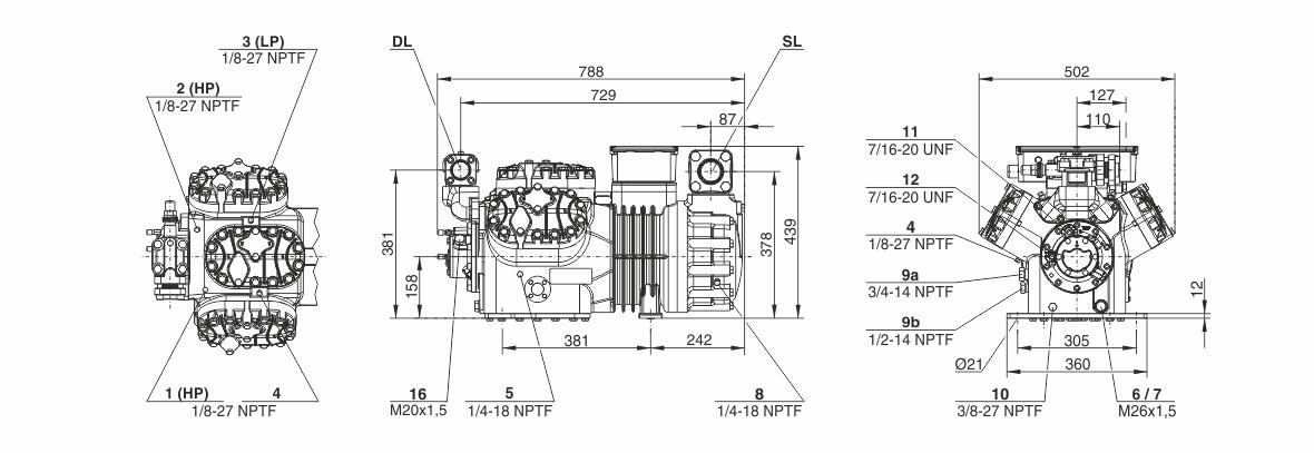 Технические данные: Рабочий объём (1450 об/мин, 50 Гц): 151,6 м³/ч; Рабочий объём (1750 об/мин, 60 Гц): 183,0 м³/ч; Количество цилиндров x диаметр x ход поршня: 6 x 82 мм x 55 мм; Вес: 244 кг; Макс. давление (LP/HP): 19 / 32 бар; Соединительный всасывающий трубопровод: 54 мм — 2 1/8 дюйма; Соединительная разгрузочная линия: 42 мм — 1 5/8 дюйма; Тип масла: R134a/R407C/R404A/R507A/R407A/R407F: BSE32 (стандартный) | R134a при температуре выше 70 °C: BSE55 (опция); Масло типа R22 (R12/R502): B5.2 (опция); Масло типа R1234yf: BSE32 (стандартный) | R1234yf при температуре выше 70 °C: BSE55 (опция); Масло типа R1234ze: BSE55 (стандартный) | при температуре выше 15 °C: BSE85K (опция) | при температуре выше 70 °C: BSE85K (опция); Масло типа R454C/R455A: BSE32 (стандартный); Масло типа R515B BSE55: (стандартный) | при температуре выше 15 °C: BSE85K (опция) | при температуре выше 70 °C: BSE85K (опция); Данные двигателя: Версия двигателя: 2; Напряжение двигателя (подробнее по запросу): 380–420 В, ПВ-3, 50 Гц; Максимальный рабочий ток: 83,2 А; Коэффициент намотки: 50/50; Пусковой ток (ротор заблокирован): 219,0 A Y / 362,0 A YY; Максимальная потребляемая мощность: 46,0 кВт; Защита двигателя: SE-B3 (опция), SE-B2 (опция), CM-RC-02 (стандарт); Класс корпуса: IP54 (стандарт), IP66 (опция); Виброгасители: Стандартный; Заправка маслом: 4,75 дм³; Запорный клапан: Стандартный; Всасывающий запорный клапан: Стандартный; Датчик температуры нагнетаемого газа: Вариант; Контроль производительности: 100-66-33% (вариант); Контроль производительности - бесконечный: 100–10 % (опция); Дополнительный вентилятор: Вариант; Инъекция хладагента (RI): Вариант; Клапан подачи масла: Вариант; Масляный нагреватель: 140 Вт (опция); Контроль давления масла: MP54 (опция).