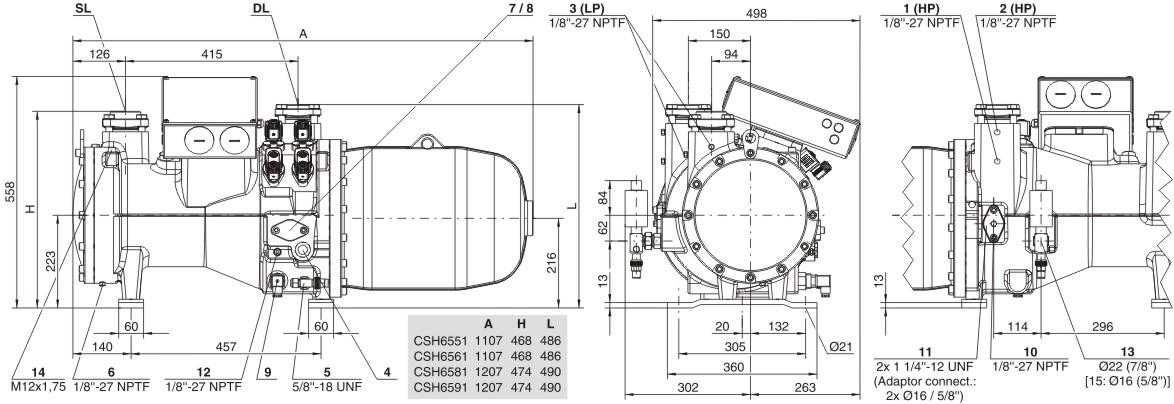 Технические данные: Рабочий объём (2900 об/мин, 50 Гц): 137 м³/ч; Рабочий объём (3500 об/мин, 60 Гц): 165 м³/ч; Вес: 322 кг; Макс. давление (LP/HP): 19 / 28 бар; Соединительный всасывающий трубопровод: 54 мм — 2 1/8 дюйма; Соединительная разгрузочная линия: 42 мм — 1 5/8 дюйма; Тип масла: R134a/R407C/R404A/R507A/R407A/R407F: BSE170 (опция); Тип масла R22: B320SH (стандартная); Данные двигателя: Версия двигателя: 1; Напряжение двигателя (подробнее по запросу): 380–415 В, ПВ-3, 50 Гц; Максимальный рабочий ток: 86,0 А; Коэффициент намотки: 50/50; Пусковой ток (ротор заблокирован): 218,0 A D / 411,0 A DD; Максимальная потребляемая мощность: 52,0 кВт; Класс корпуса: IP54; Масляный нагреватель: 200 Вт (стандарт); Маслоотделитель: Стандартный; Масляный фильтр: Стандартный; Датчик температуры нагнетаемого газа: Стандартный; Контроль мощности — 4 этапа: 100-75-50-25 % (стандарт); Контроль производительности - бесконечный: 100–25 % (стандарт); Встроенный обратный клапан: Стандартный; Защита двигателя: SE-E1 (стандартный), INT69VSY-II (стандартный для 660–690 В); Заправка маслом: 9,5 дм³.