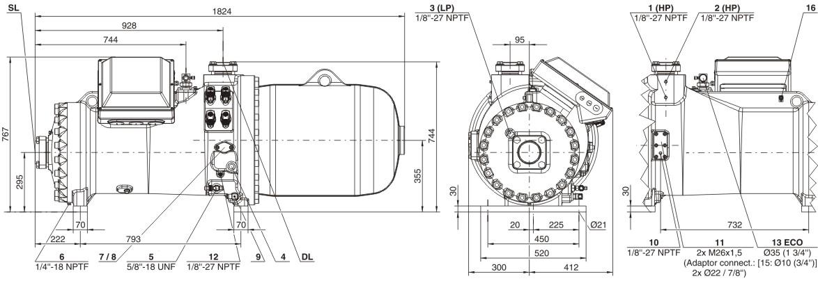 Технические данные: Рабочий объём (2900 об/мин, 50 Гц): 535 м³/ч; Рабочий объём (3500 об/мин, 60 Гц): 646 м³/ч; Вес: 1280 кг.; Макс. давление (LP/HP): 19 / 28 бар; Тип масла: R134a/R407C/R404A/R507A/R407A/R407F: BSE170 (опция); Тип масла R22: B320SH (стандартная). Данные двигателя: Версия двигателя: 1; Напряжение двигателя (подробнее по запросу): 380–415 В, D-3, 50 Гц; Максимальный рабочий ток: 330,0 А; Пусковой ток (при заблокированном роторе): 465,0 A Y / 1442,0 A D; Максимальная потребляемая мощность: 205,0 кВт; Масляный нагреватель: 300 Вт (стандарт); Маслоотделитель: Стандартный; Масляный фильтр: Стандартный; Контроль мощности — 4 этапа: 100-75-50-25 % (стандарт); Встроенный обратный клапан: Стандартный; Защита двигателя: SE-E1 (стандартный), INT69VSY-II (стандартный для 660–690 В); Запорный клапан: Вариант; Всасывающий запорный клапан: Вариант.