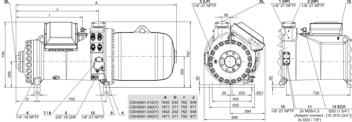 Технические данные: Рабочий объём (2900 об/мин, 50 Гц): 910 м³/ч; Рабочий объём (3500 об/мин, 60 Гц): 1098 м³/ч; Вес: 1370 кг.; Макс. давление (LP/HP): 19 / 28 бар; Тип масла: R134a/R407C/R404A/R507A/R407A/R407F: BSE170 (стандартный). Данные двигателя: Версия двигателя: 2; Напряжение двигателя (подробнее по запросу): 380–415 В, D-3, 50 Гц; Максимальный рабочий ток: 360,0 А; Пусковой ток (при заблокированном роторе): 650,0 A Y / 2029,0 A D; Максимальная потребляемая мощность: 222,0 кВт; Масляный нагреватель: 300 Вт (стандарт); Маслоотделитель: Стандартный; Масляный фильтр: Стандартный; Контроль мощности — 4 этапа: 100-75-50-25 % (стандарт); Защита двигателя: SE-E1 (стандартный), INT69VSY-II (стандартный для 660–690 В); Заправка маслом: 35,0 дм³. Запорный клапан: Вариант; Всасывающий запорный клапан: Вариант.