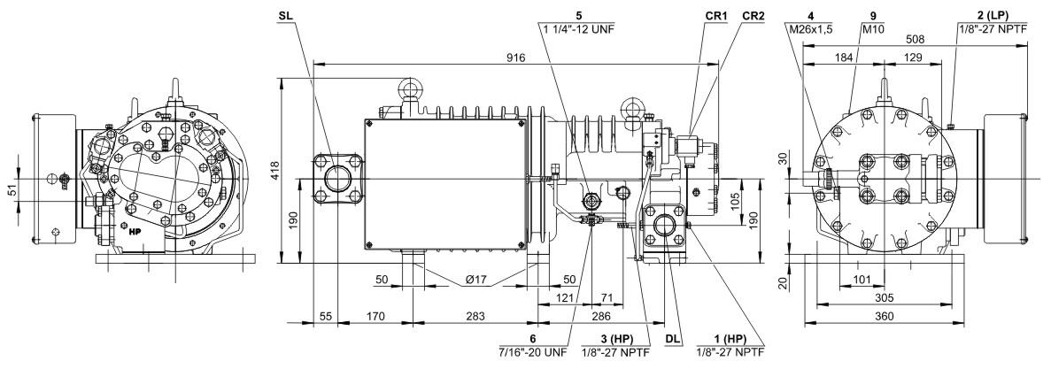 Технические данные: Рабочий объём (2900 об/мин, 50 Гц): 140 м³/ч; Рабочий объём (3500 об/мин, 60 Гц): 168 м³/ч; Вес: 234 кг.; Максимальное давление (LP/HP): 19 / 28 бар; Адаптер/запорный клапан: 22 мм — 7/8 дюйма (опция); Тип масла R22: B150SH, B100 (опция); Тип масла: R134a/R404A/R507A/R407A/R407F: BSE170; Тип масла R448A/R449A/R454C: BSE170. Данные двигателя: Версия двигателя: 1; Напряжение двигателя (подробнее по запросу): 380–415 В, ПВ-3, 50 Гц; Максимальный рабочий ток: 65,0 А; Пусковой ток (при заблокированном роторе): 187,0 A D / 313,0 A DD; Максимальная потребляемая мощность: 42,1 кВт; Датчик температуры нагнетаемого газа: Стандартный; Регулирование расхода масла: SE-B3 (стандартный); Защита двигателя: SE-E1 (стандартный), SE-E3 (стандартный для 660–690 В); Всасывающий запорный клапан: Стандартный; Контроль производительности: 100-75-50 % (стандарт); Запорный клапан: Вариант; Защита двигателя: SE-i1 (200–690 В); Уровень звуковой мощности (-35 °C / 40 °C): 86,5 дБ(А); Уровень звукового давления на расстоянии 1 м (-35 °C / 40 °C): 78,5 дБ(А).