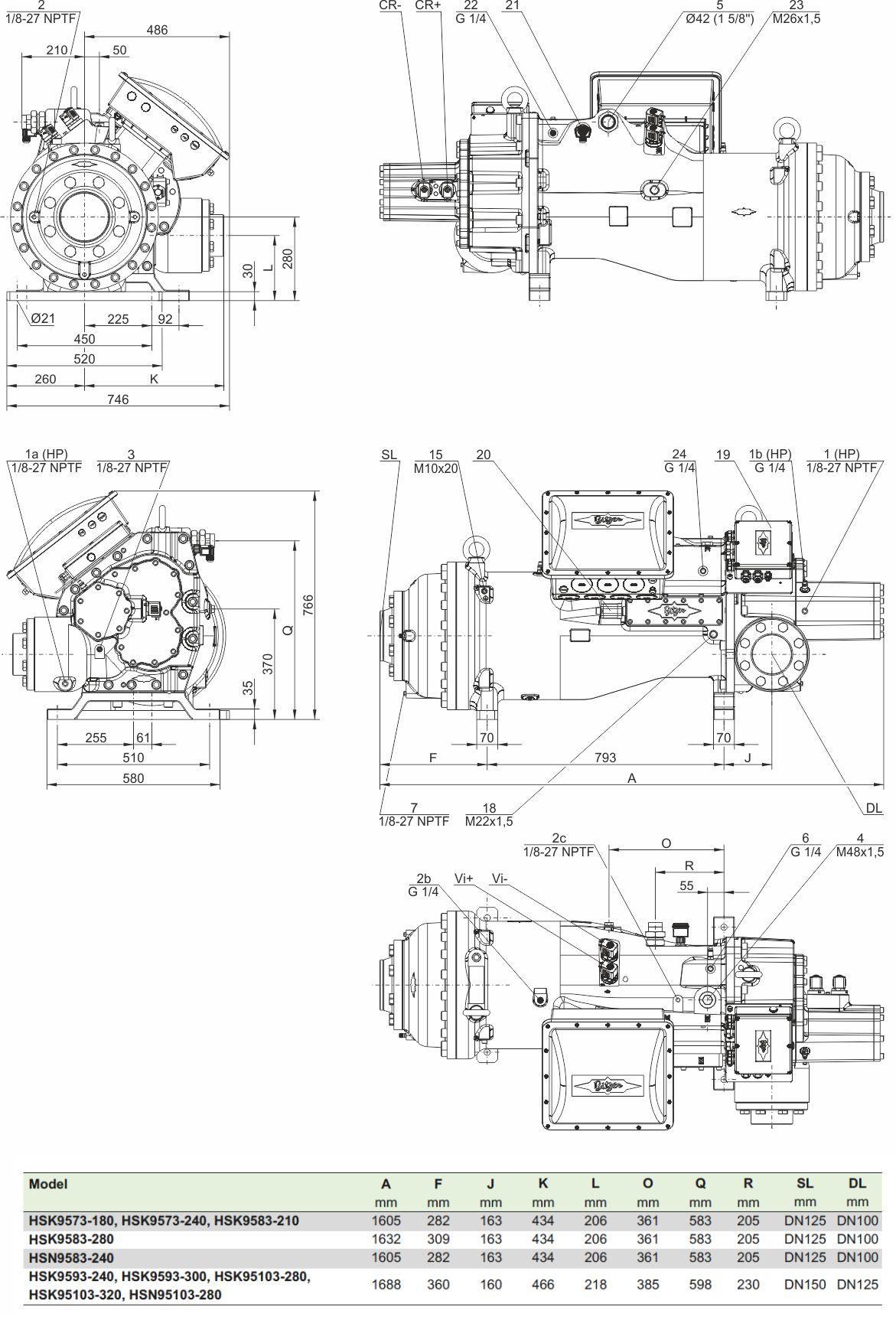 Технические данные: Рабочий объём (2900 об/мин, 50 Гц): 1015 м³/ч; Рабочий объём (3500 об/мин, 60 Гц): 1225 м³/ч; Вес: 1100 кг.; Макс. давление (LP/HP): 19 / 32 бар; Тип масла R22: B150SH, B100 (опция); Тип масла: R134a/R404A/R507A/R407A/R407F: BSE170; Тип масла R448A/R449A/R454C: BSE170. Данные двигателя: Версия двигателя: 1; Напряжение двигателя (подробнее по запросу): 380–415 В, D-3, 50 Гц; Максимальный рабочий ток: 480,0 А; Пусковой ток (при заблокированном роторе): 805,0 A Y / 2520,0 A D; Максимальная потребляемая мощность: 290,0 кВт; Датчик температуры нагнетаемого газа: Стандартный; Комплект для впрыска масла: Стандартный; Защита двигателя: CM-SW-01 (стандартный); Запорный клапан: DN 125 (опция); Адаптер и запорный клапан для возврата масла: Вариант; Нагреватель крышки клеммной коробки: Вариант.