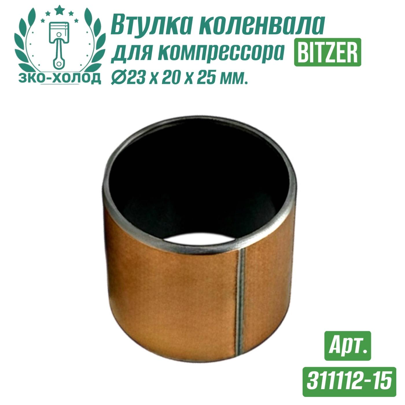 ЗАВОД КОМПРЕССОРНОГО ОБОРУДОВАНИЯ предлагает запчасти к холодильному компрессору Bitzer (Битцер). Втулка коленвала (подшипник скольжения) Bitzer (311112-15); Размеры втулки: Ø23 x Ø20 x 25мм.; Код Bitzer: 311112-15; Внутренний №: 20.09.002; Совместимость с компрессорами Bitzer: 2КС; 2JC; 2НС-1,2; 2НС-2,2; 2FC-2,2; 2FC-3,2; 2GC-2,2; 2KES -0,5; 2JES-0,7; 2HES-1; 2HES-2; 2GES-2; 2FES-2; 2FES-3; 2HL-1,2; 2GL-2,2; 2FL-2,2. Втулка является точным направляющим элементом для валов и подшипников.
