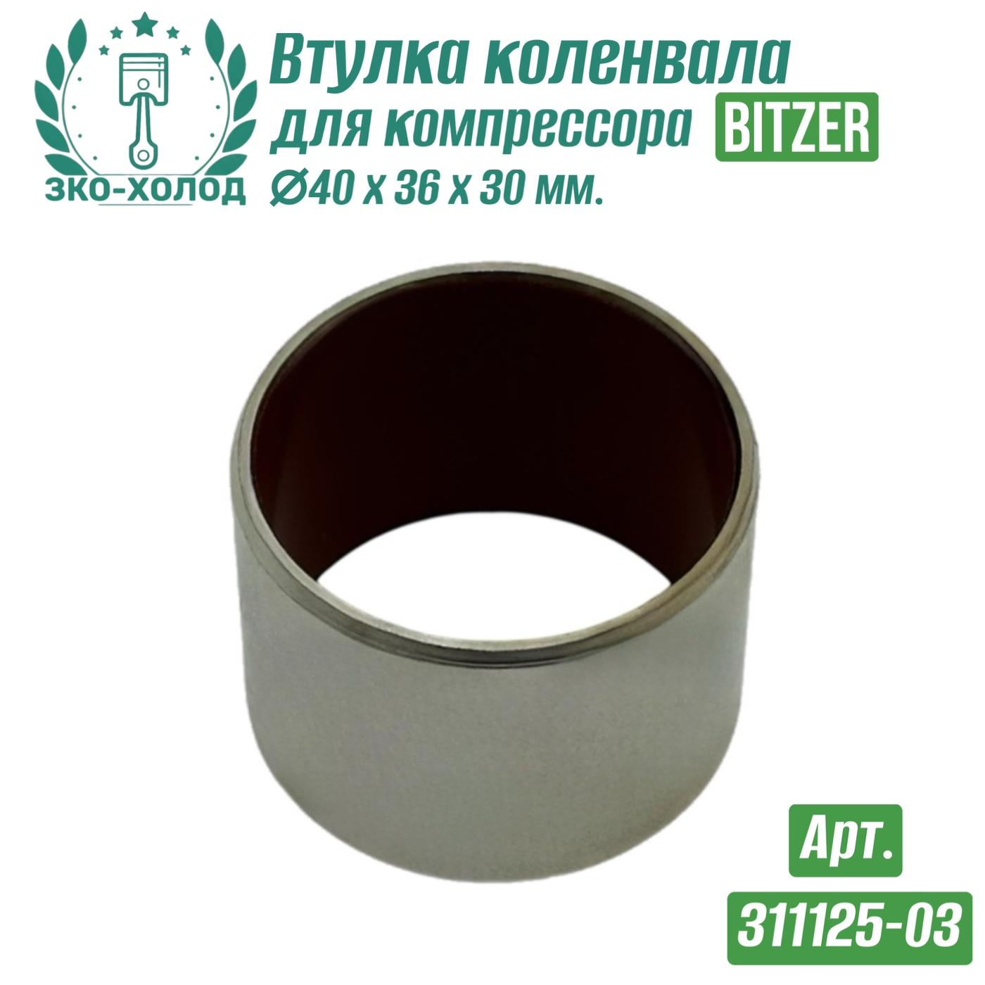 ЗАВОД КОМПРЕССОРНОГО ОБОРУДОВАНИЯ предлагает запчасти к холодильному компрессору Bitzer (Битцер). Втулка коленвала (подшипник скольжения) Bitzer (311125-03); Размеры втулки: Ø40 x Ø36 x 30 мм.; Код Bitzer: 311125-03; Внутренний №: 20.09.004; Совместимость с компрессорами Bitzer: 2ЕС; 2DC; 2CC; 2CES-4; 2EL; 2DL; 2CL; 2ЕES; 2DES; 2CES; 4ЕС; 4DC; 4CC; 4FC; 4ЕES; 4DES; 4CES; 4FES; 4BES-9. Использование втулок делает работу компрессора более надежной, эффективной и долговечной, что особенно важно в системах непрерывного охлаждения.